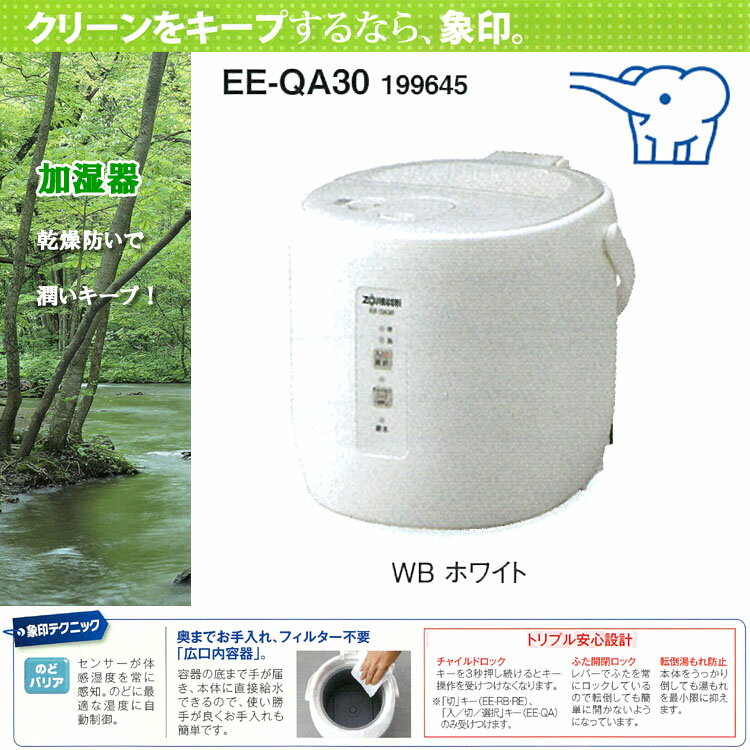 象印 スチーム式加湿器(8畳?13畳)EE-RB50-CA【セール】【バーゲン】 象印だけの「ポット型」スチーム式加湿器はヤカンで直接給水&奥までカンタンお手入れ!面倒なフィルター交換も不要です。 トリプル安心設計のファミリー向け加湿器。 給水・お手入れカンタンな水タンク一体型「広口内容器」象印のスチーム加湿器は内容器自体が電気ポットやまほうびんのように水タンクになっており、しか (更新日時:2011/01/29 13:40) Supported by 楽天ウェブサービス |